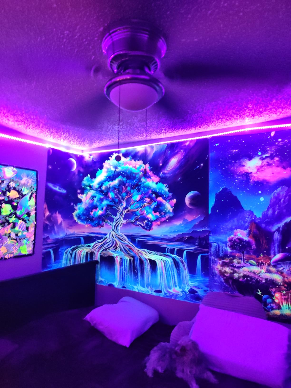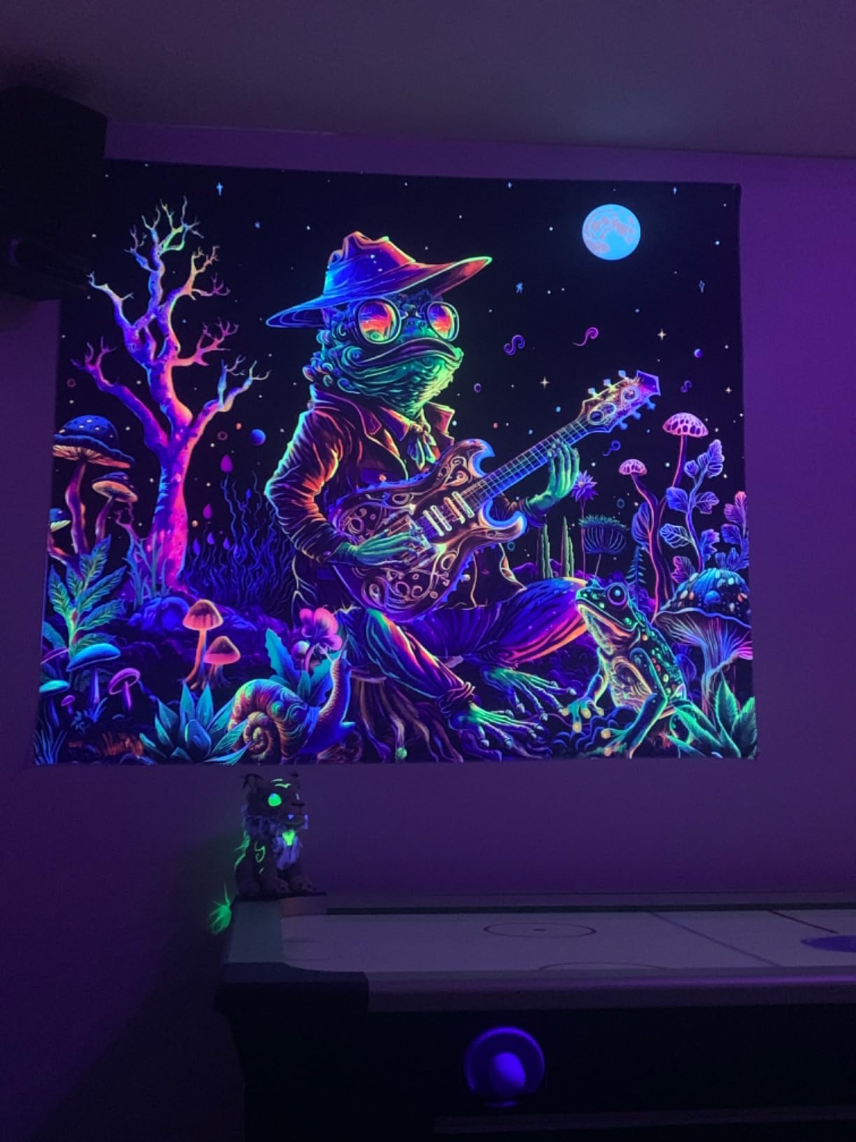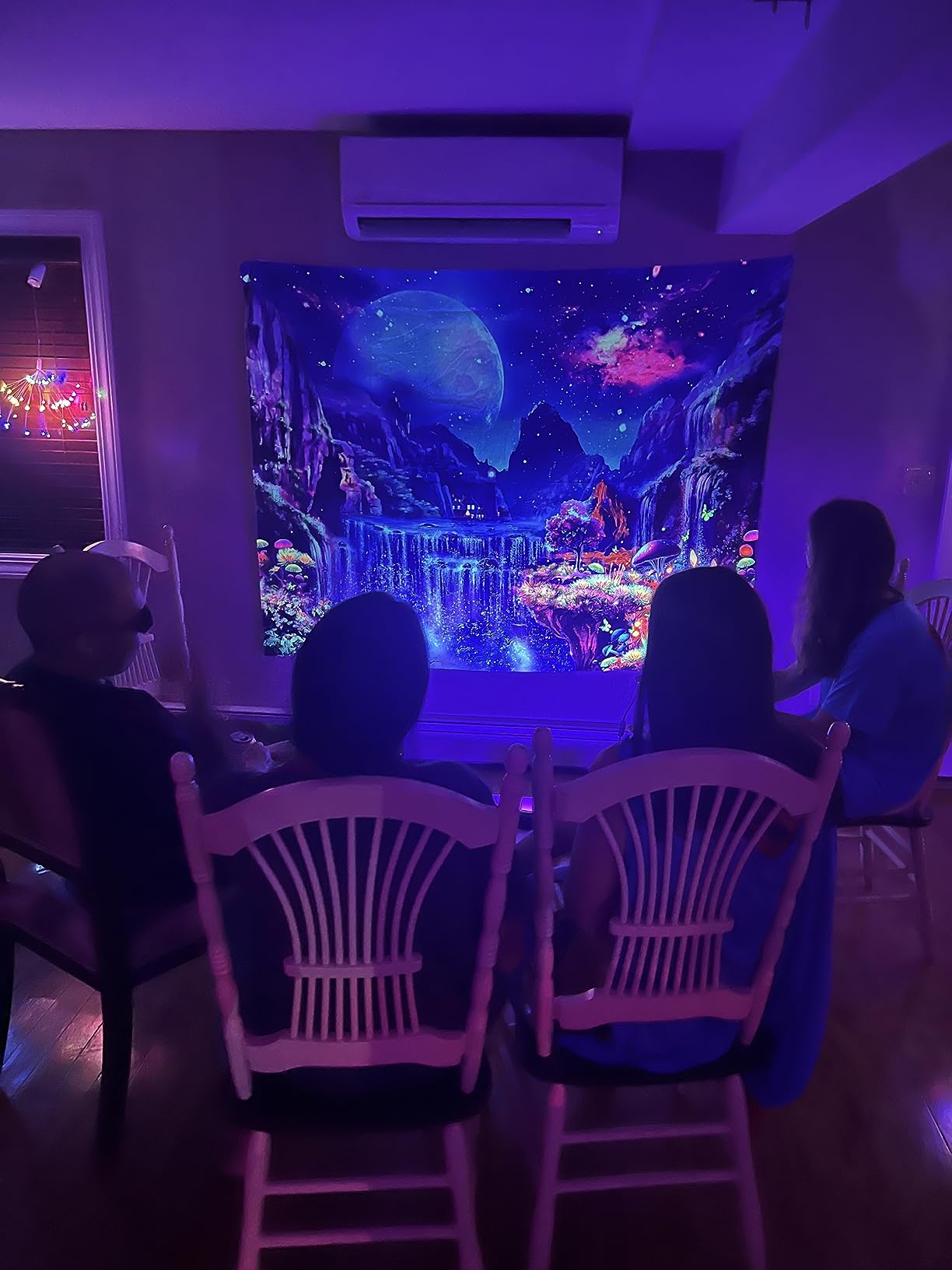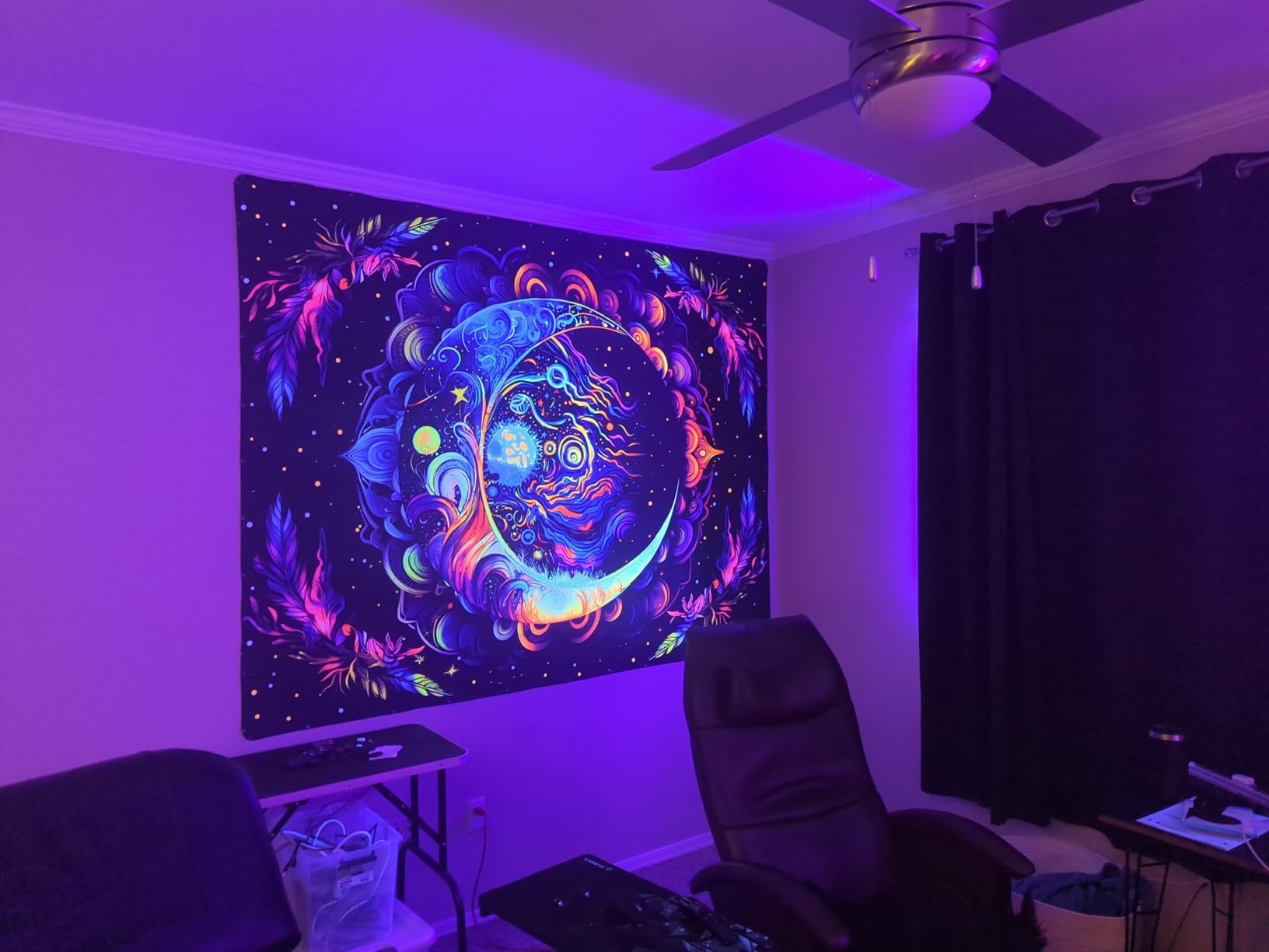 I’ve bought tapestries before but nothing like this. The colors pop under UV — feels like a totally different space when the lights go out.