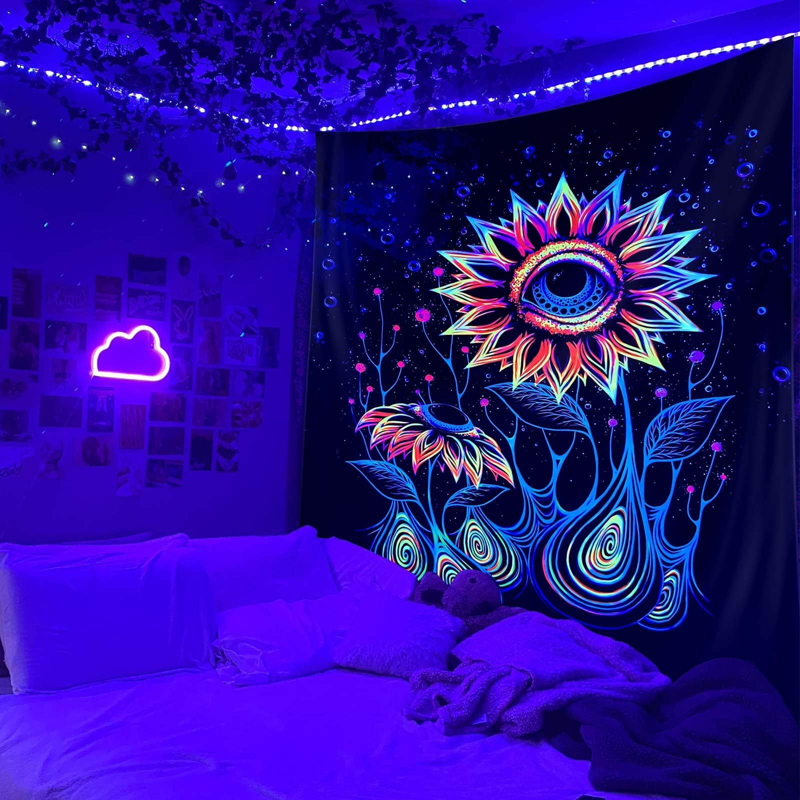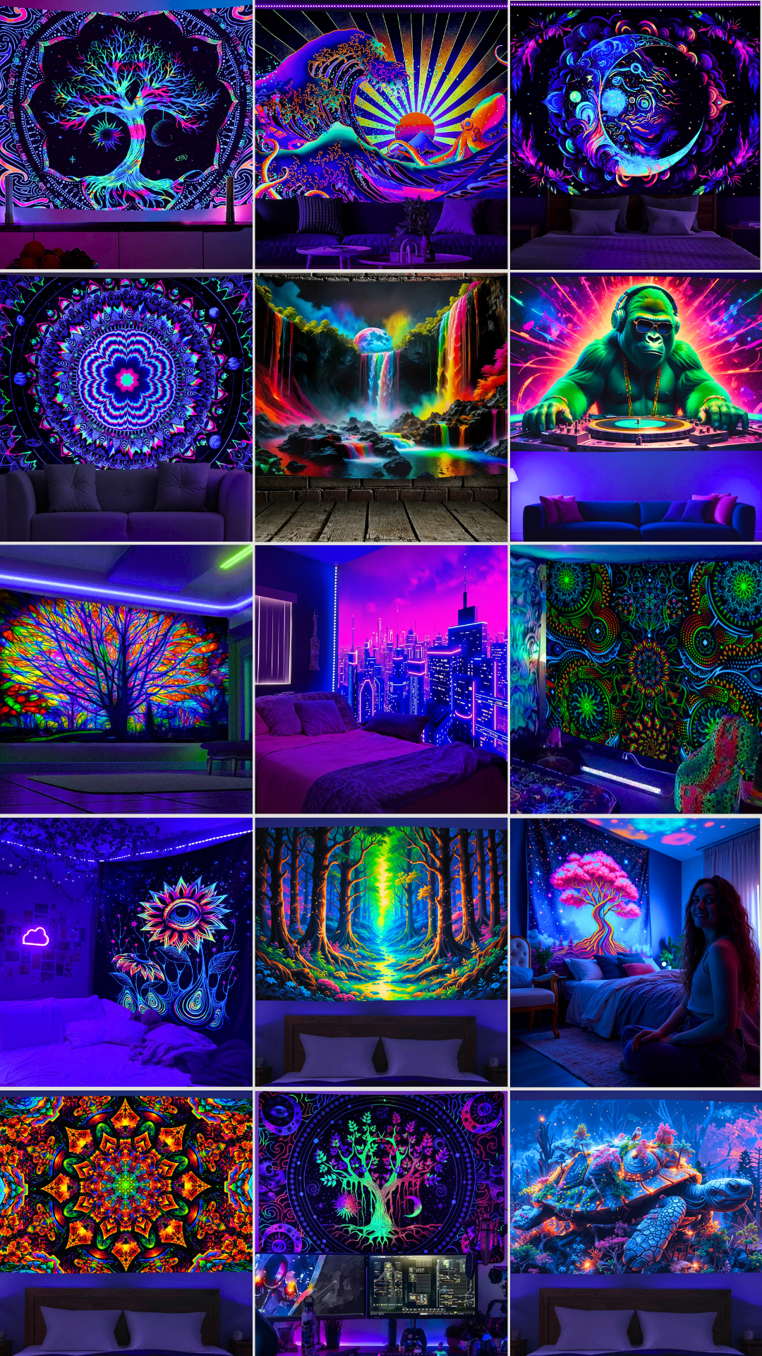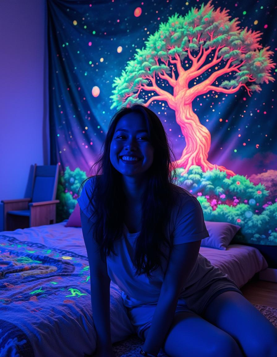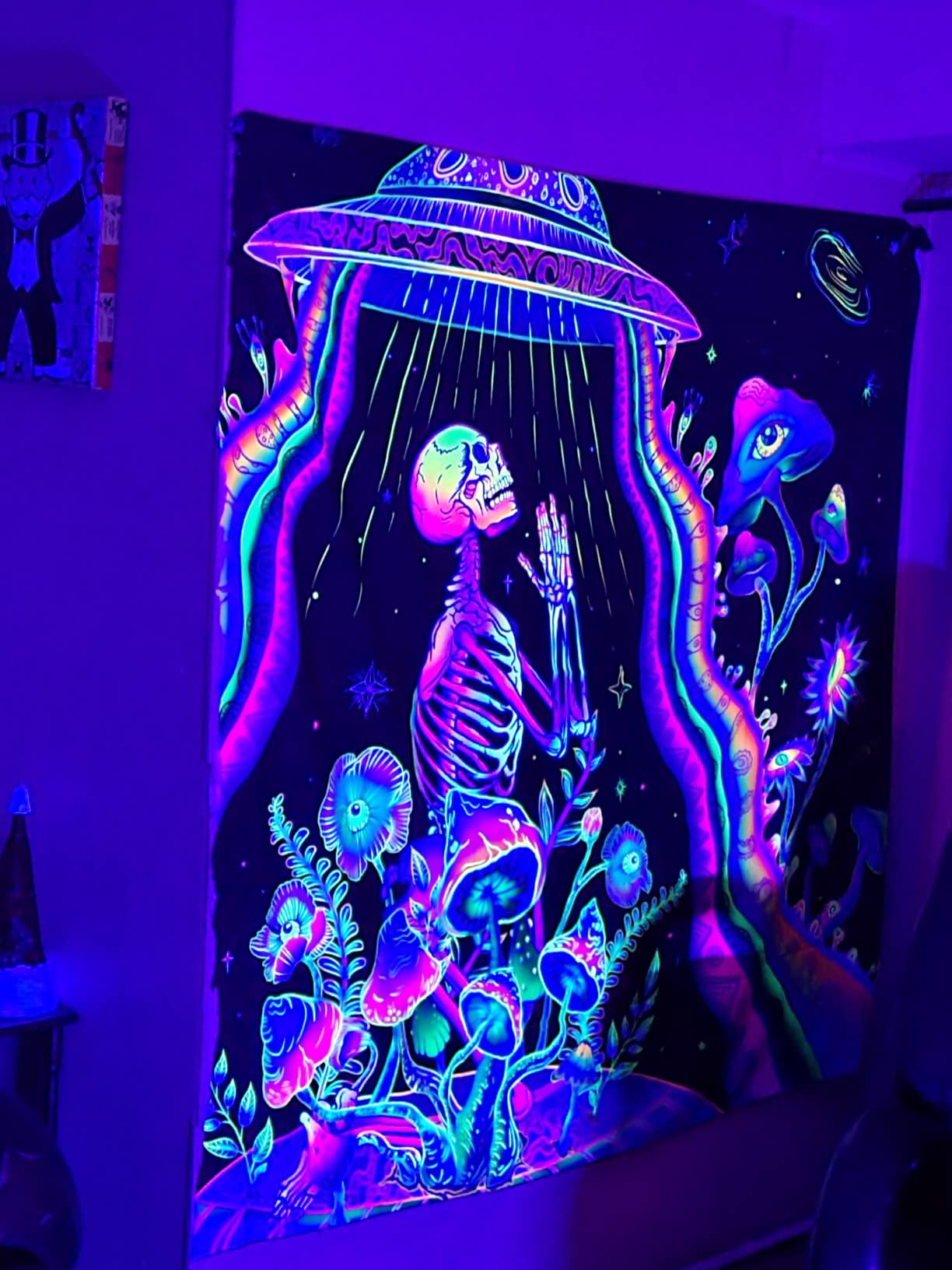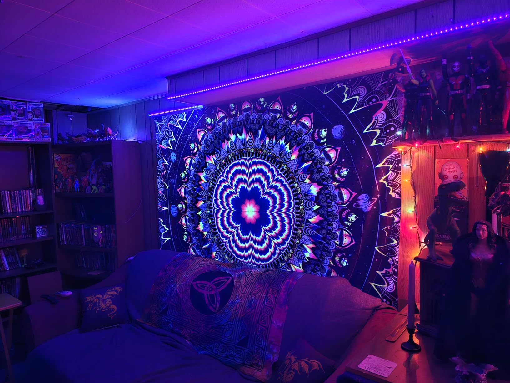 I’ve bought tapestries before but nothing like this. The colors pop under UV — feels like a totally different space when the lights go out.